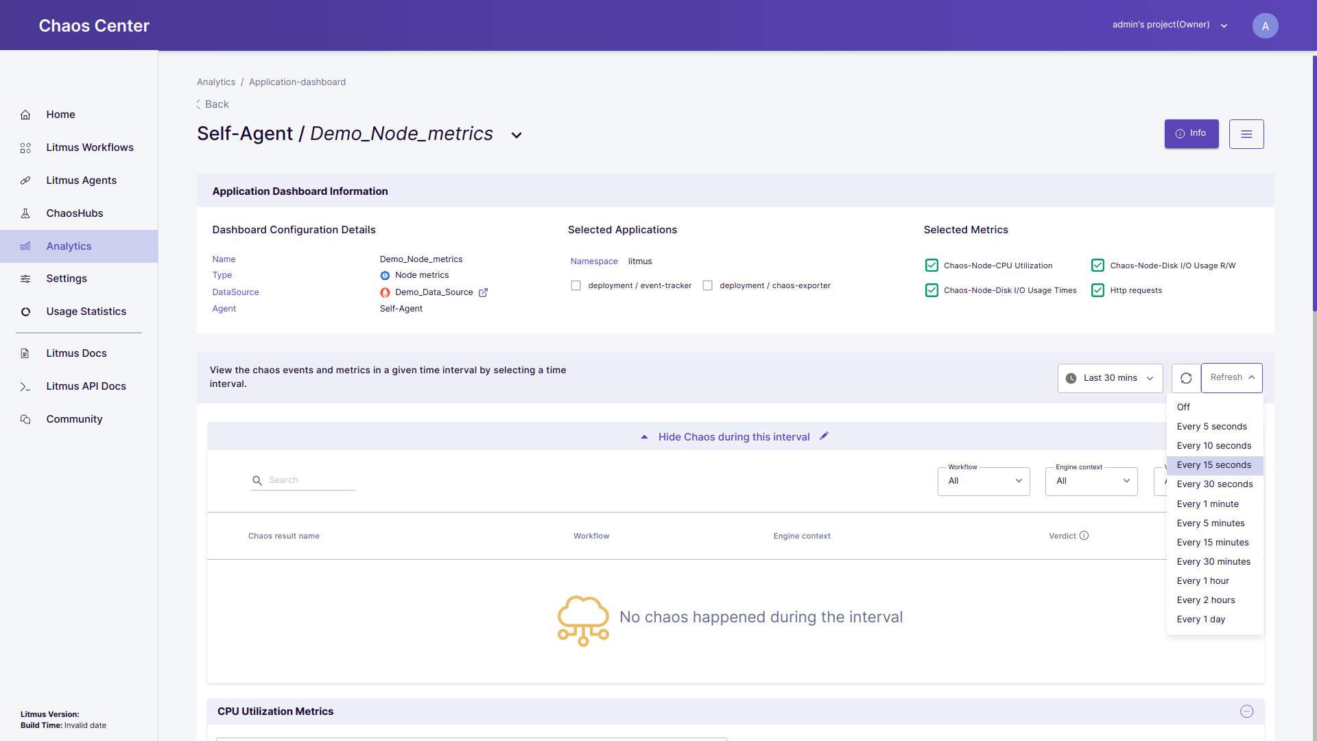 • Refresh rate: As the metrics data for a given data source is updated so to query and update all the graphs on the dashboard you may provide a refresh rate. By default, the refresh rate is set at 15 seconds.
